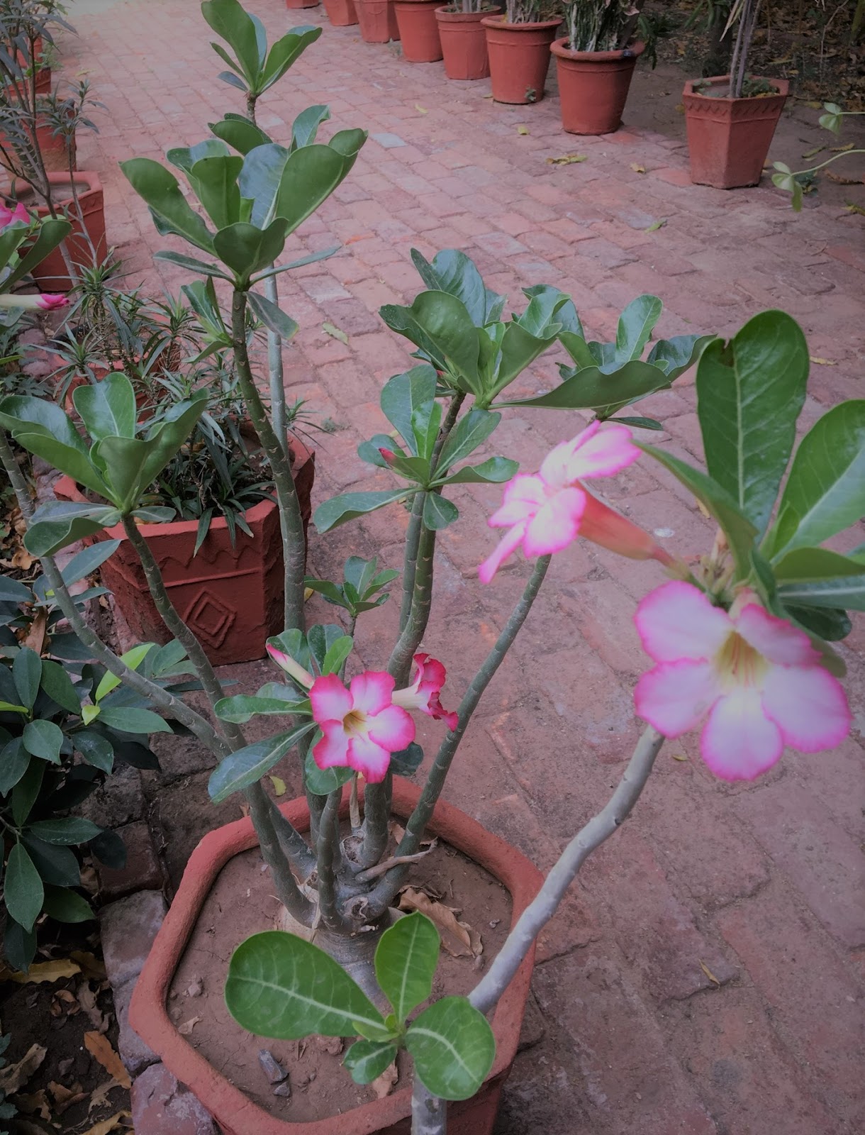 The Adenium stood there looking wasted for months. I kept complaining “it is dead, at least do some cutting, perhaps it will grow?” “No Ben (Sister in Gujarati), it is not dead”. “No Ben, it does not need to be cut”. A couple of months passed and I get impatient. “You should cut this at the top stems”, I point out to Babubhai. “No Ben, it will flower directly now from the top stems, we should not cut it.” OK, now that it is so many months, might as well wait. And so we waited. Another month, and imagine my excitement when I see green shoots at the top of each of the stems! And a few more weeks, there are bright green leaves and “Oh My GOD!” Pink flowers bloom!!