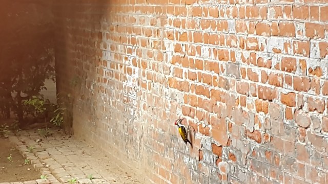 And finally, a wood pecker, pecking on the damp walls of neighbours at IIM, Ahmedabad. This woodpecker has truly adapted to his urban surroundings. He no longer needs wood or a tree for pecking. Pecking on the damp walls affected by saline water and capillary action is good enough for him!! So much for inclusive urbanisation!