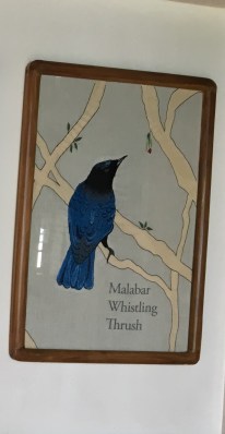 There was a whistling sound that Ansal alerted us to. This was the Blue Malabar Whistling Trush. All through our walk in the woods we could hear the whistling of the Malabar Thrush. We saw the bird in the trees, but were unable to get a picture as it flitted from one tree to another as it noted our movements. There was a beautiful embroidered photo framed of the Malabar Whistling Trush in the Widermere Estate premises.