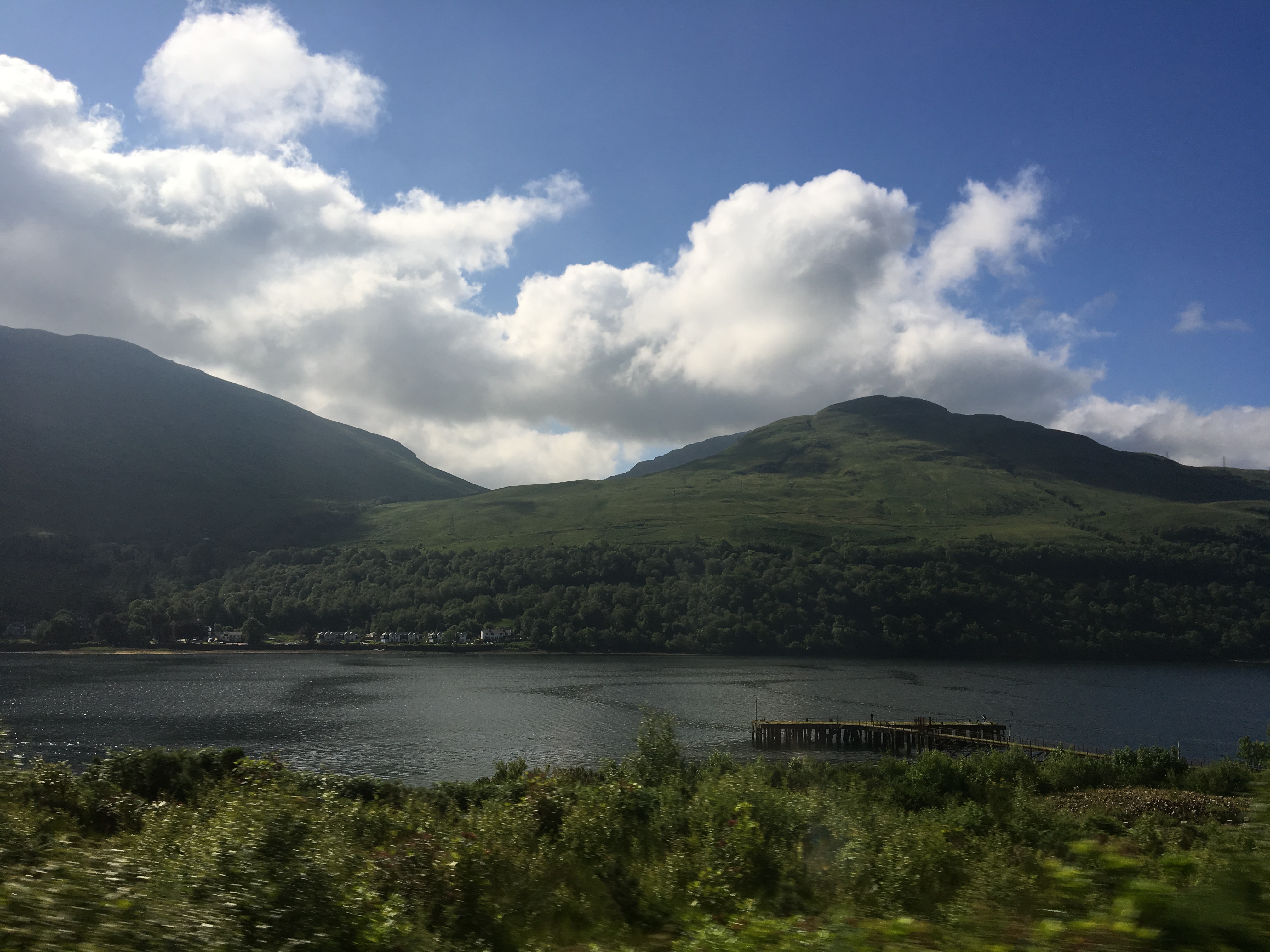 We were blessed with warm bright sunshine and mild wind on our day trip of the Western Highlands of Scotland! We had an excellent tour guide, David, who had an amazing knowledge of the land, its history and long tales to tell of its gallant clans and their battles for the thrown of Britain. We started from Glasgow along the River Clyde past the majestic Dumbarton Rock with a castle perched on it seeming to guard the river.