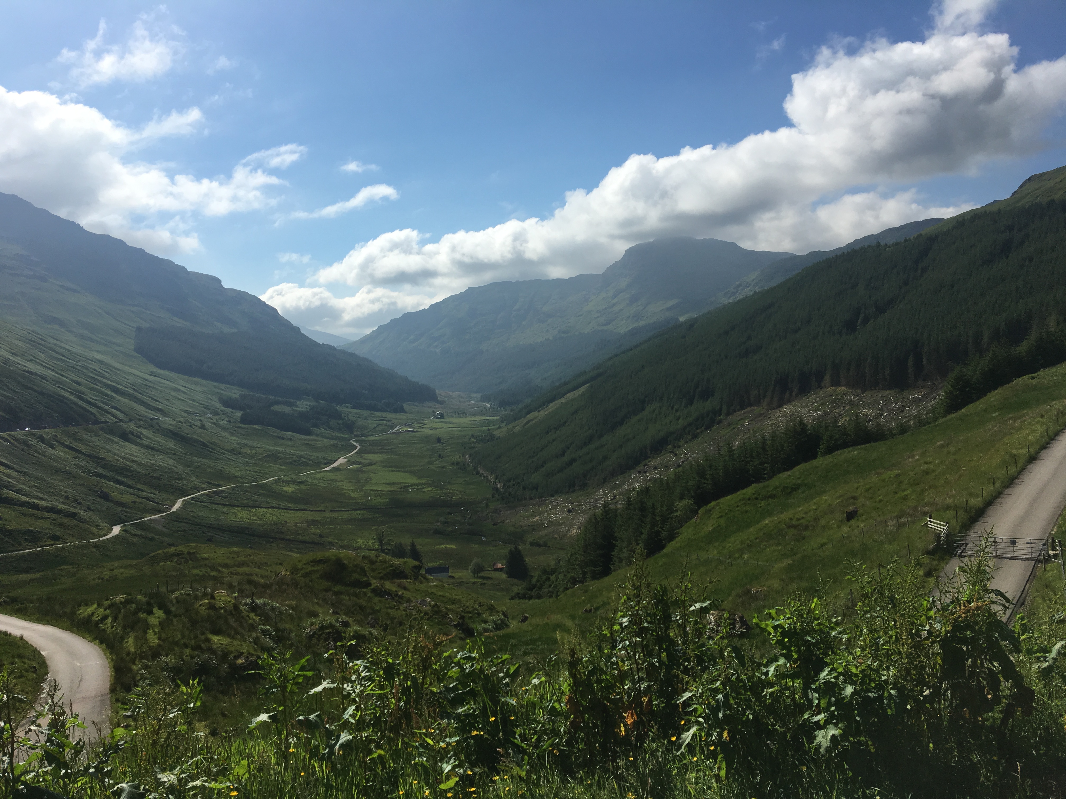 My first sight of a Loch in the highlands was Loch Long, as we drove along side it and. Calm and serene waters, rollings hills covered with patches of thick, what looked like, coniferous trees. We skirted the northern tip of Loch Long and drove up a steep mountain pass known as the ‘Arrochar Alps’ to our first stop at ‘Rest and Be Thankful’ an iconic viewpoint. This was the name carved on the stone by weary soldiers who built the original military road in 1753. It is the summit of the mountain pass between Arrochar and Inveraray.