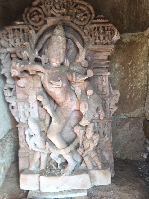 The Kunda, Ramkund or Suryakund, was an interesting structure with a flight of steps leading into it from the Gundhamandapa. In fact, the rectangular reservoir or tank had flights of steps from all sides. The tank probably had a spring underneath in ancient times, which would have kept the water fresh, like water in a well. But now, with the sinking water table in the region, the water was not quite fresh. It has a greenish tinge to it. Around the tank were sculptures of various deities. The two main shrines on either side had sculptures of Nataraja and Shitala Devi. There was a sculpture of Lord Ganesha. It is said there is a stepwell and steps leading to down into it. Two pillars standing separate to the west probably holds the entrance to the stepwell. We failed to explore it. Never mind, next time!