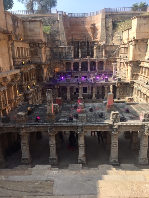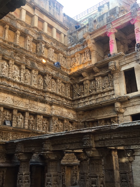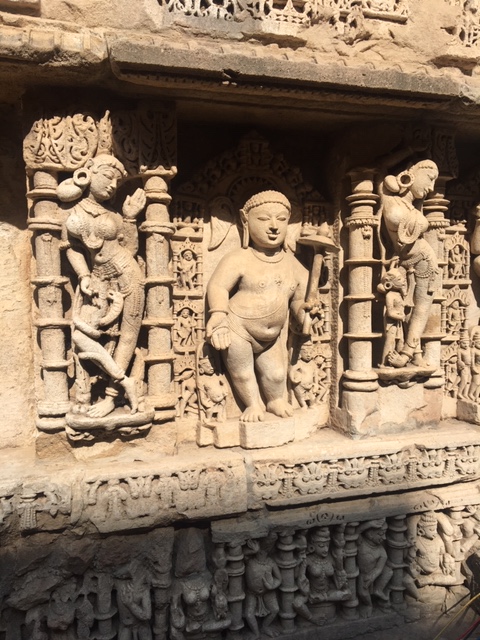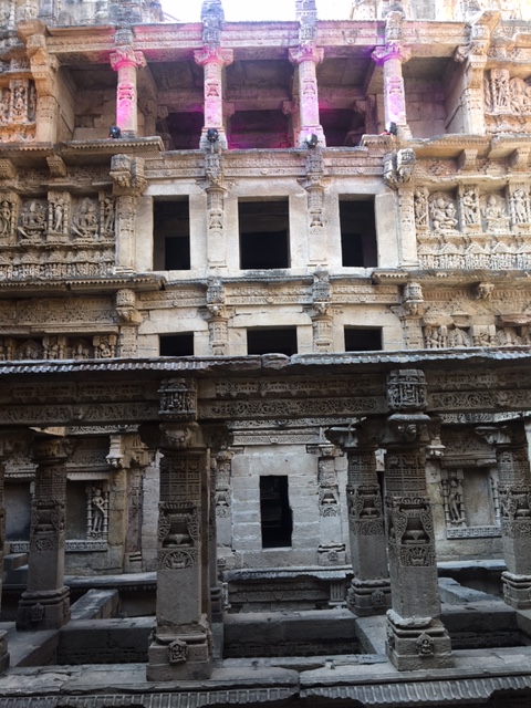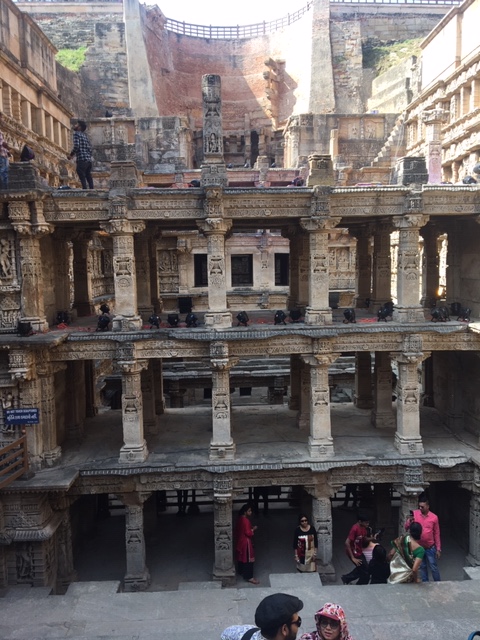 A short drive from the Sun Temple took us to the Rani Ki Vav, Stepwell, in Patan district. It is a massive structure with seven floors below the ground, said to be one of the largest stepwells in the region. Rani (Queen) Udayamati, wife of Bhima I, of the Chalukya dynasty, is said to have built it in his memory. It was built on the banks of the Saraswati river and was submerged by floods, till it was rediscovered and excavated in the 1940s by the then Baroda State.