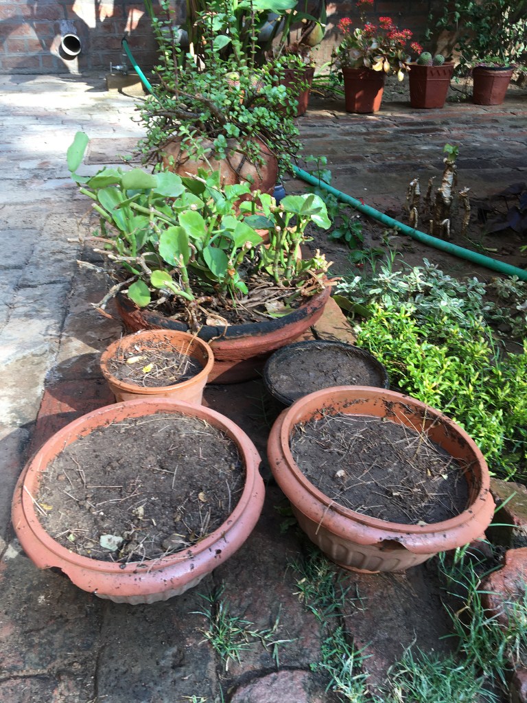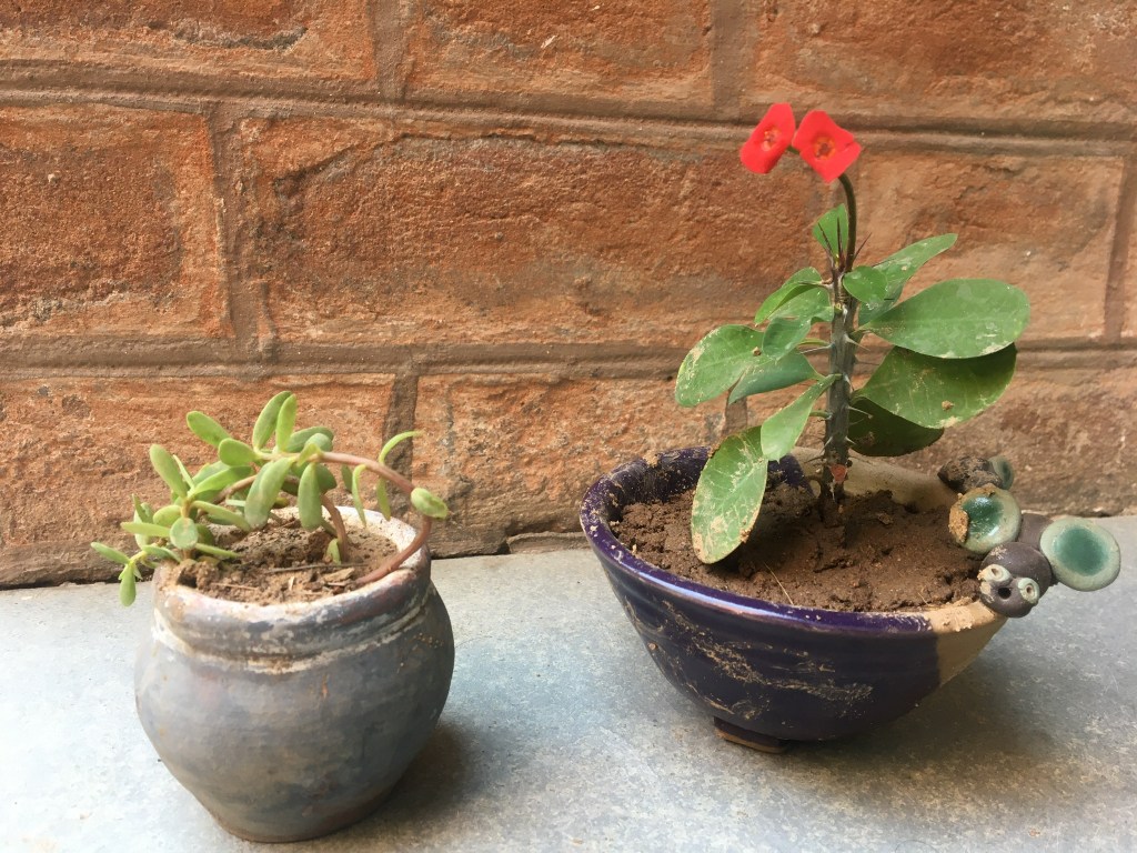 Yesterday we tried our hand at gardening. I have over the years tried vegetable gardening and failed. Again blaming this to the sandy soil and saline water in this land. When I moved south briefly, to an area with more black alluvial soil, I found that the vegetables grew better, the leaves of the spinach were at least double the size in this town. Recently a green entrepreneur gifted us four sets of seeds, tomato, broccoli, lettuce and kale, green vegetable of the cabbage family. So I decided to try my luck again. We have planted these in four separate temporary pots. Hopeful that the seedlings will appear soon! I also got a couple of little pots planted with little cactus plants. Credit to all of this goes to the gardener. I hope he has a green thumb and we will soon see some green shoots!