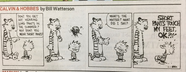 Hobbes is stating the norm or mores of the Western way of clothing where in summer everyone strips down to the bare minimum! “Don’t you get hot wearing long pants in the summer?” Long pants out, shorts are in!