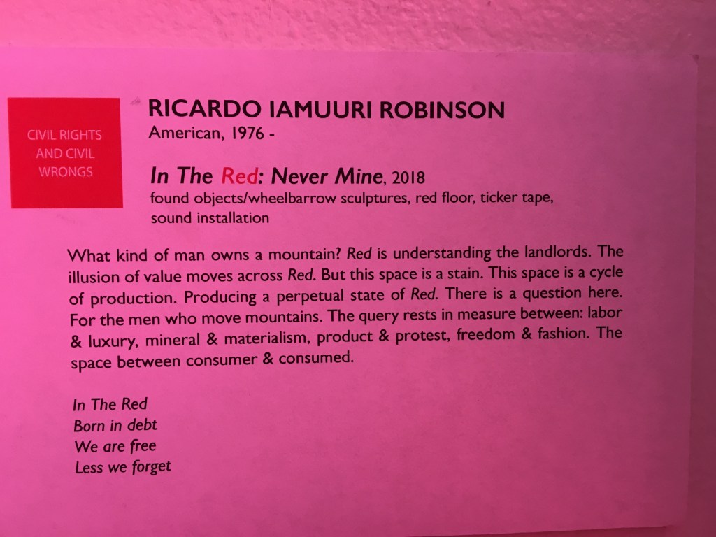 Ricardo Iamuuri Robinson is a singer, song writer and an audio-visual artist. His installation ‘In the Red: Never Mine’, 2018 appeared to be exploring class inequalities between the landlord and the workers in the cycle of production. “In the RED, Born in Debt, Less we Forget”. The installation was a wheelbarrow, red floor and a sound in the background. We stood gaping!