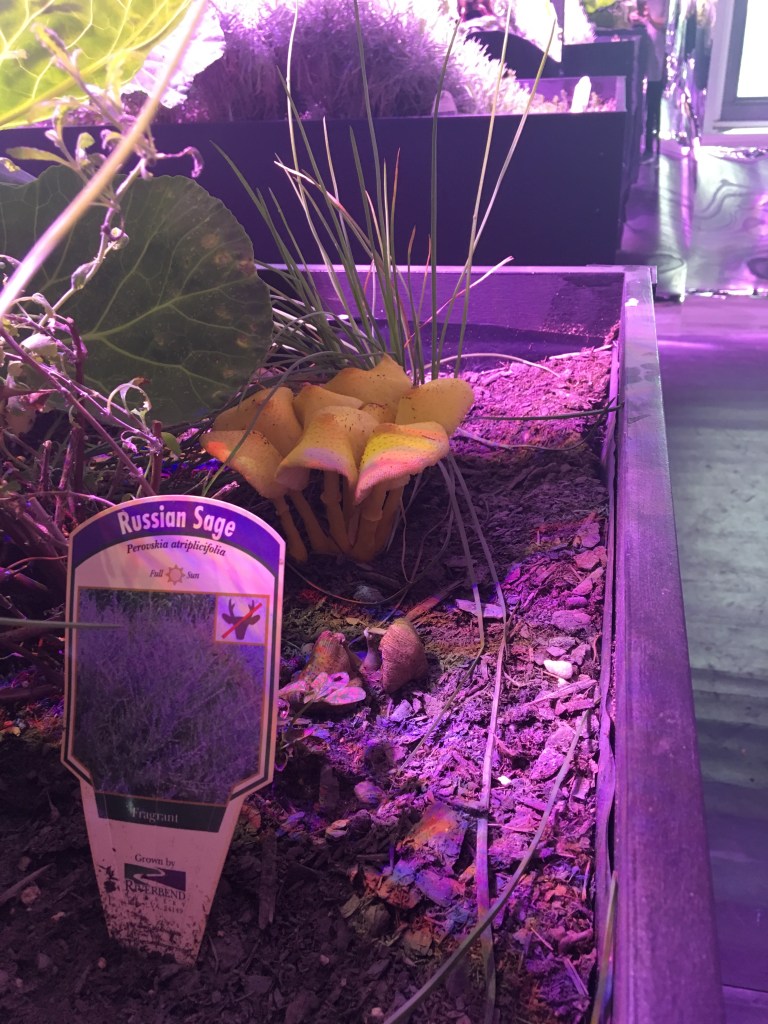 Meg Webster is an installation artist whose theme of art is around concerns of the depleting environmental resources around us. She has been doing earth installations composed of nectar plants to support the bees who are affected by the depleted natural resources. We saw this amazing installation creating an artificial sunlight glow for the nectar plants. The Russian Sage is a conventionally lavender purple flowering plant. LED lights were powered by photovoltaic panels, fueled by solar energy.