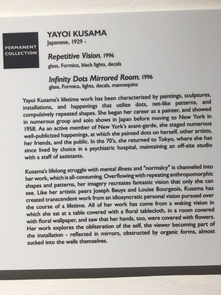 1. Very cool that you got to experience one of Yayoi Kusuma’s “Infinity Rooms”! One was featured in an exhibit of her work, nearby in Washington DC, but it was so swamped that I couldn’t get in. So thank you for sharing your photos of the room 🙂