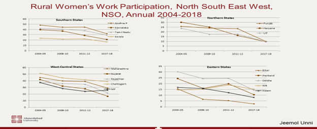 To conclude, when a macroeconomic shock hits the country there are no North South divergences in the impact. Socio-cultural differences or rice-wheat cultivation do not seem to make any difference to change in women’s work participation. The same has been noted by many scholars during the shock of strict lockdown during the pandemic in India. Basically, when there is a shock in the economy, women are pushed out of the work force. The ‘Discouraged Worker’ effect operates and women do not offer themselves for work (remain outside the labour force) which occurs irrespective of North, South, East or West of the country.