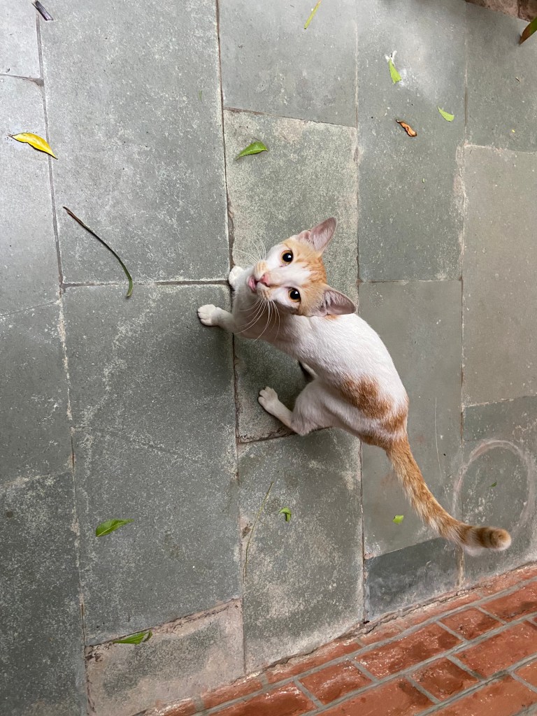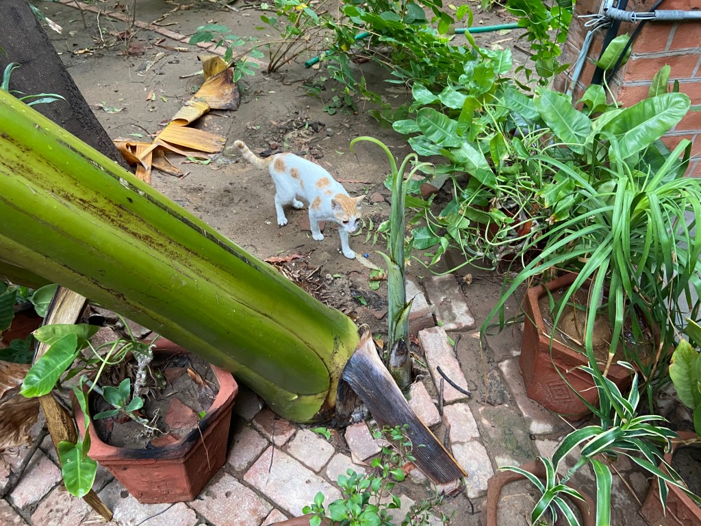 On the morning of May 18th, 2021, Mr. Percival and Kitty arrived to check us out. They appeared a little confused too. Percival, Kitty and I took a short space walk to inspected the damage! Our banana tree could not withstand the ferocity of the storm and fell. It takes months for the bunch of bananas to bloom fully. Fortunately the bananas were full grown and we did not lose our banana harvest. Our green shade, attempt to save the plants from the searing heat, collapsed in the fierce winds.