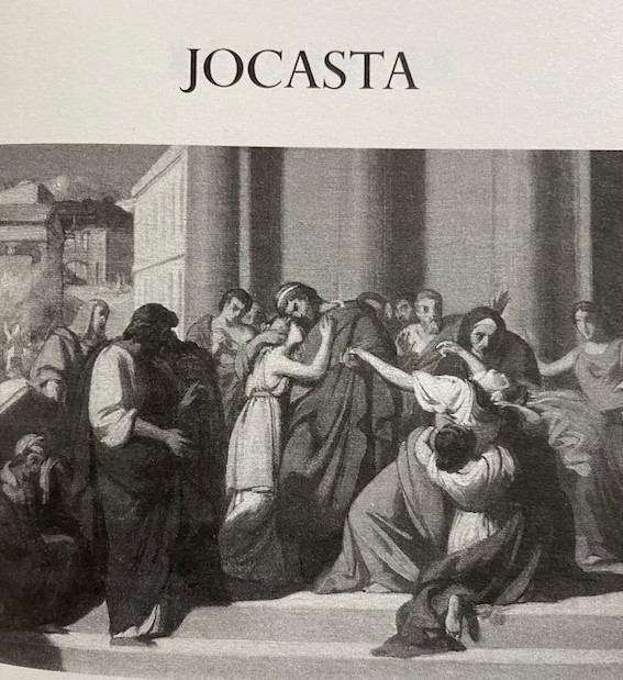 In Sophocles’s version Jocasta is introduced only half way through the play. Oedipus tells her that Creon, her brother, is accusing him of being the killer of her first husband, Liaus. Jocasta says that a seer had told Liaus that he would be killed by his own son and so he had abandoned their only born son to die in the mountains, pinning his feet together when he was just three days old. And Liaus was killed by bandits, so not likely to be Oedipus. But Oedipus hears that there was a survivor of the bandit attack on Liaus and sends for him.