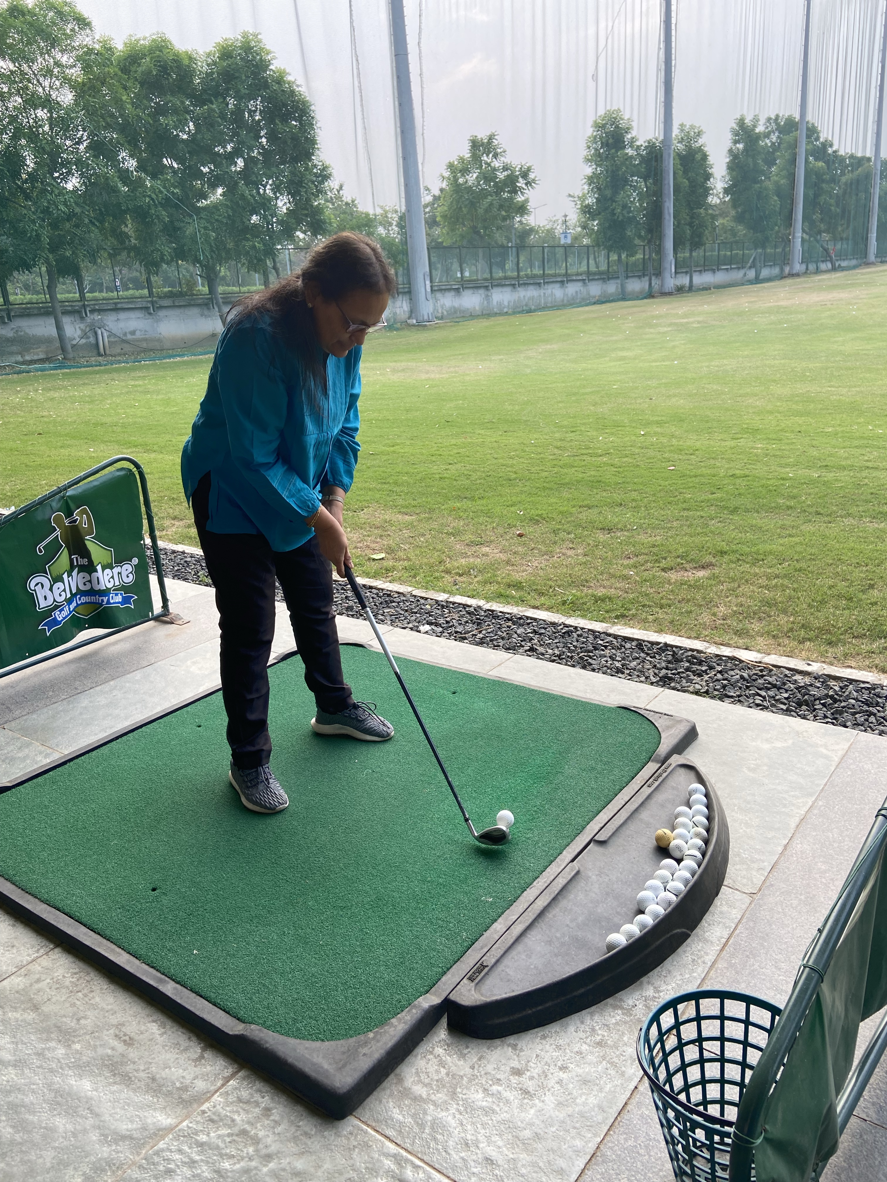 Arjun taught me two important things, the posture of your body and the grip of your hands on the shaft of the club are crucial. For the posture, feet apart, knees slightly bend and the torso held straight and bend at an angle. Only the shoulder should move from right to left while you swing the club and strike the ball or ‘tee off’ with eyes on the ball all the time and torso held straight! The swing is what gives the force to the strike. The grip for a right handed person: the left thumb and the index finger gripping the shaft of the club should form a V pointing to the right shoulder at the top of the shaft. Lower on the shaft the right hand will cover the left thumb, with the left thumb and left index finger forming a V pointing to the left shoulder. The grip has to be firm on the shaft, relaxing the right hand when the club swings to the left after striking the ball. Complex? Well, not really when this is shown to you by a coach like Arjun.