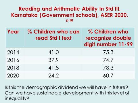 Is this the demographic dividend we have? Is sustainable development possible with this levels or proficiency in learning going forward? This data in Karnataka are from field survey in government schools. The chances are that the situation may be less alarming in some private schools. This points to inequality in system of education. The situation is likely to be worse if we consider the gender of children and learning outcomes.