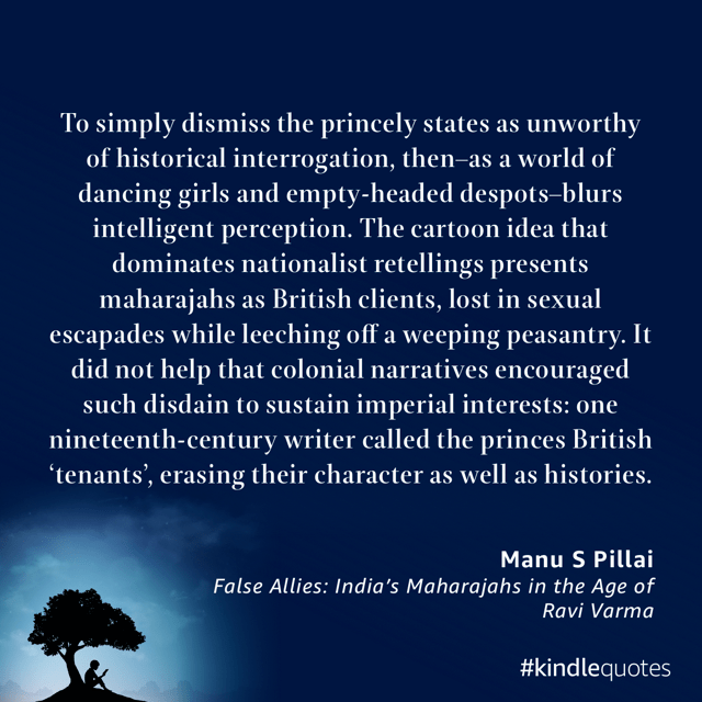 False Allies: India’s Maharajahs in the Age of Ravi Varma by Manu S Pillai, Juggernaut, September 2021, essays the story of the Princely states of India. His pick of states seems random, powerful dynasties such as the Maharajas of Travancore (Kerala), the Wadiyars of Mysore (Karnataka), the Gaekwads of Baroda (Gujarat) and the Maharanas of Mewar (Rajasthan). The odd one out is Pudukkottai (Tamil Nadu). The choice of these different locations are loosely connected through the travels of the portraitist and painter Raja Ravi Varma (1848-1906).