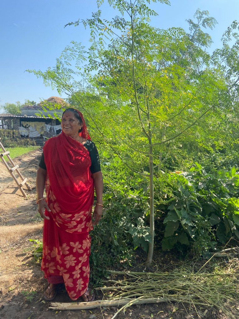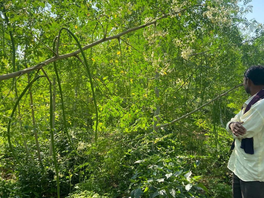 We visited Radha’s naturally farmed Moringa (drumsticks) fields. She had cows in cowshed with drains that tools the cow urine into a tank. Along with a mulch of Cow dung and crop waste natural manure was formed. A system of pipes took this directly to the fields of wheat and Moringa.