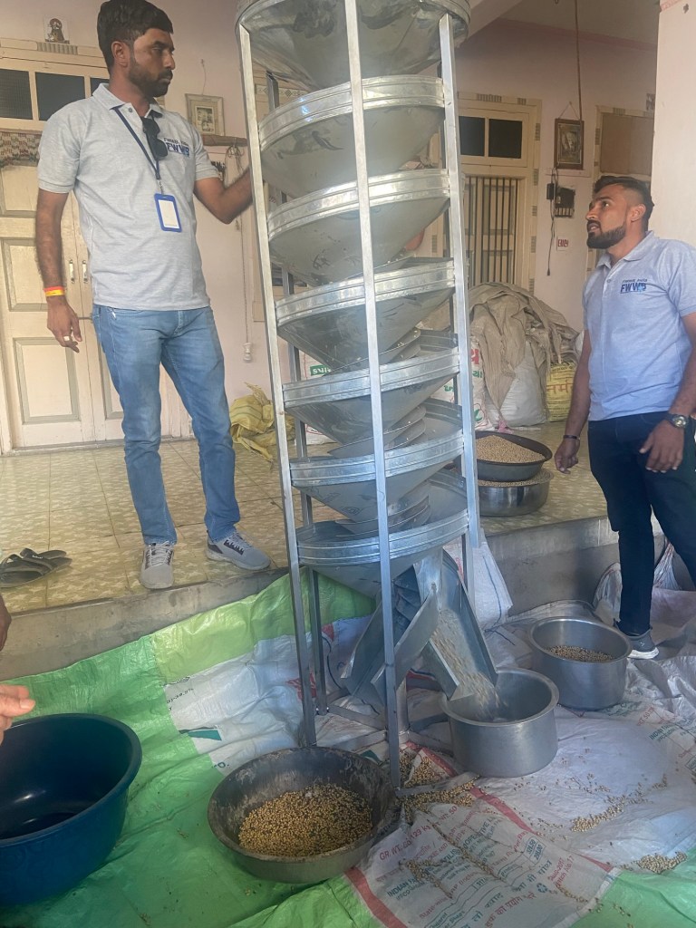 In Jasingpara, Amreli district we visited a Spiral Seed Grader Enterprise of a farmer. This machine separated the seeds from mud and also graded the seeds by quality. The home and enterprise was surrounded by high walls and gates. Apparently the Gir Lions Sanctuary is nearby and the lions roam the area freely at times.