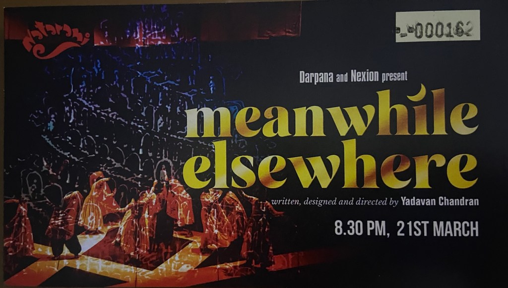 Darpana Academy, a Dance And Theatre school, was started by Mrinalini Sarabhai, now run by her daughter, Mallika Sarabhai. It is celebrating its 75th year. Darpana, in collaboration with Nexion, staged a musical drama ‘Meanwhile Elsewhere’ at the Natarani amphitheater. It was a spectacular drama presented on a multilevel stage with unique and exciting props. The props were, among others, long lengths of white and pink cloth and reams of polythene paper.