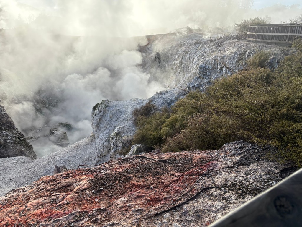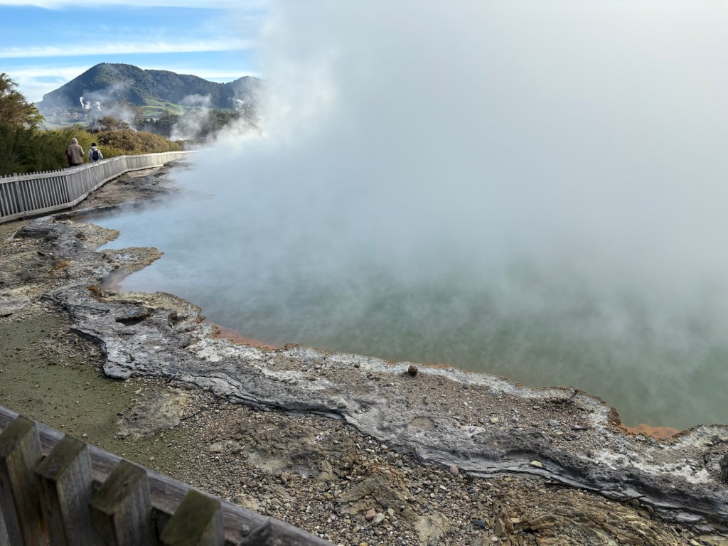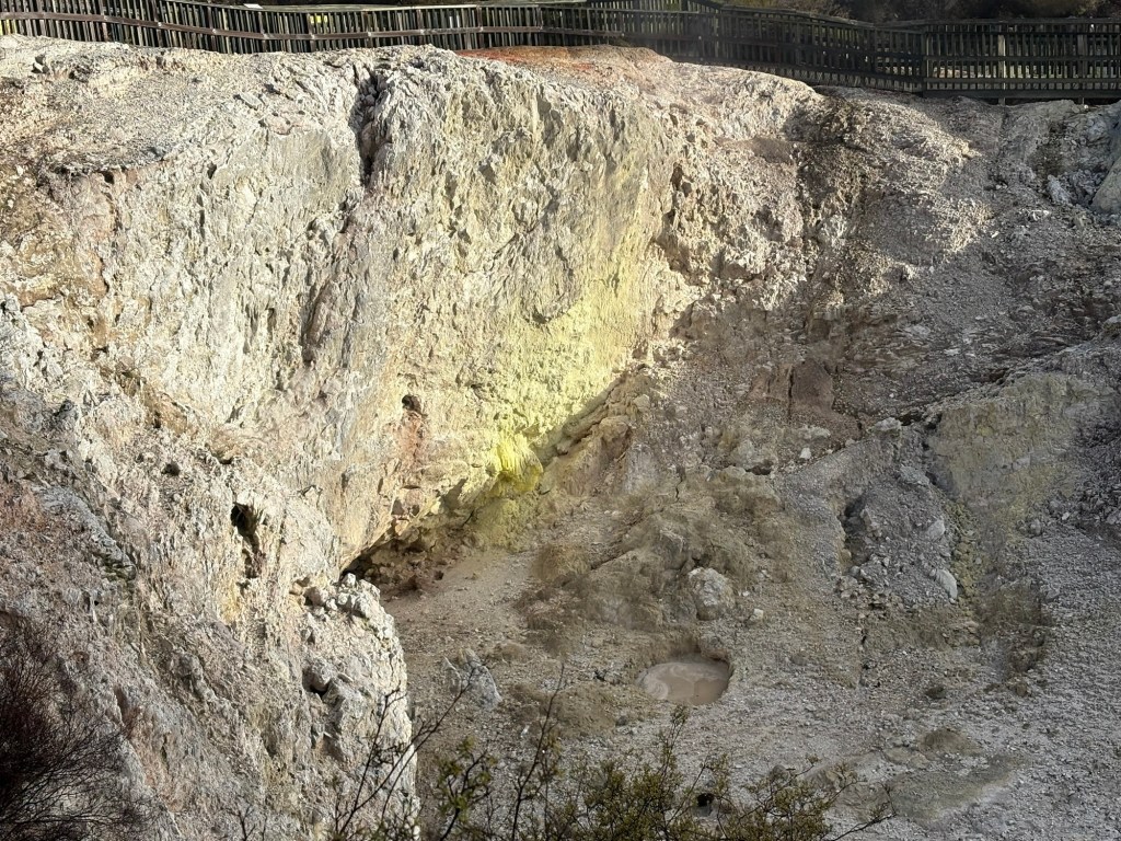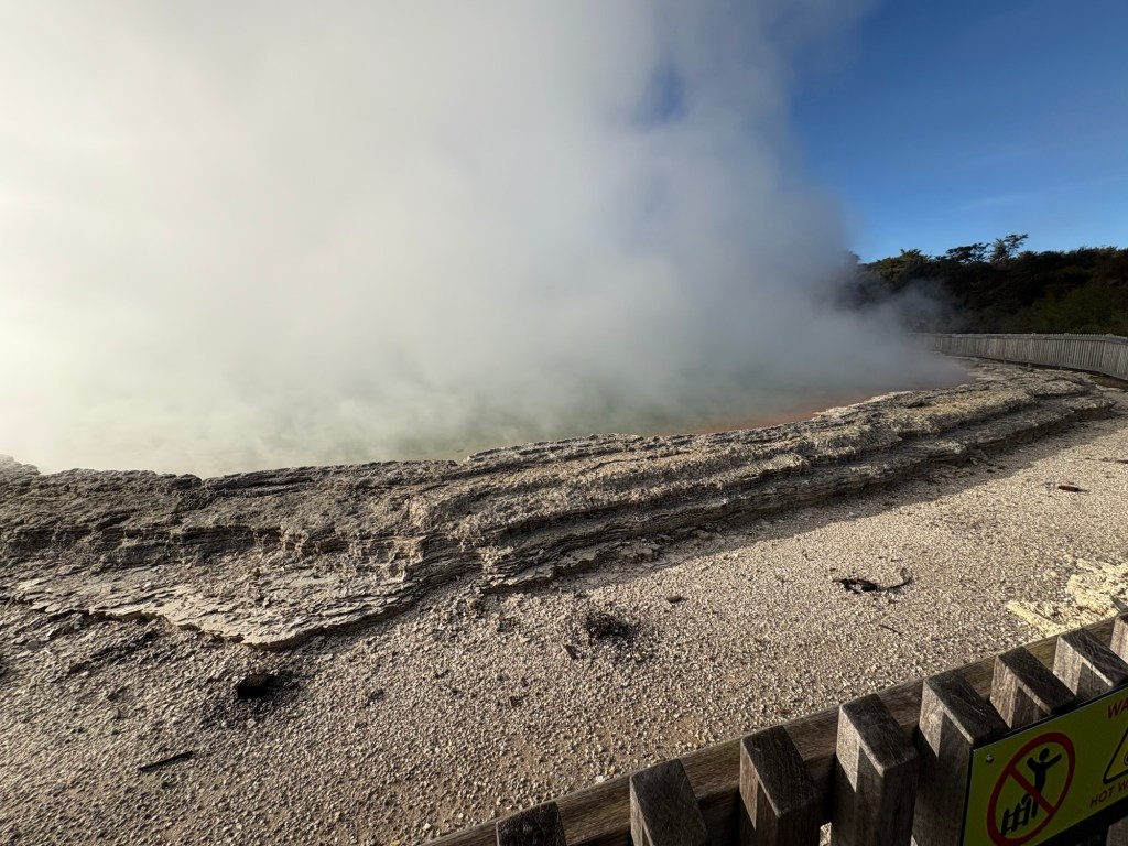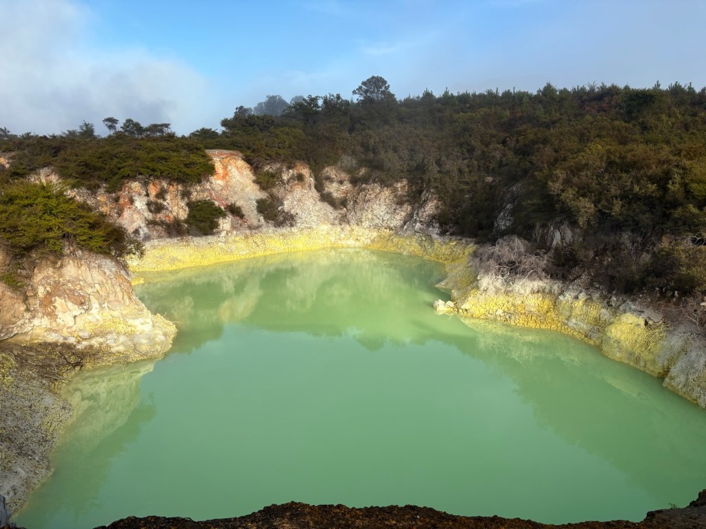 The Champagne Pool is the largest hot spring in New Zealand with a surface temperature of 74 degrees Celsius. The bubbles caused by carbon dioxide provide the Champagne like effect in the water. It was formed an estimated 700 years ago by a hydrothermal eruption, some of the minerals contained in the water include gold, silver, mercury, sulphur, arsenic, thallium, and antimony!! Unfortunately we did not find any gold or silver! No There was a fog of vapour and gasses over the crater which gave us poor visibility.