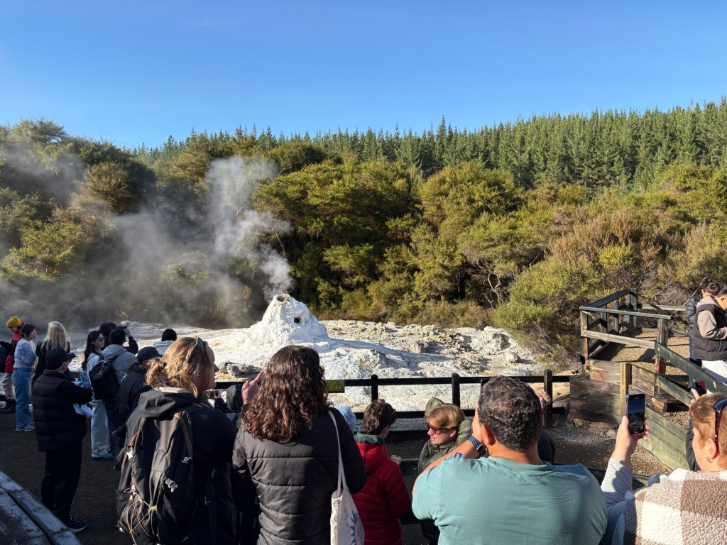 We visited the Lady Knox Geyser where everyday at 10.15 am the discovery of the geyser is enacted. In 1901, the first open prison in New Zealand was established at Waiotapu, its object was to accommodate some of the better-behaved prisoners from around the jails of the Rotorua Lakes District. A gang of those prisoners were amazed when the geyser erupted. It was so discovered when they first added soap to the hot water to wash their clothes! Lady Knox eruption is enacted by adding soap to the mouth of the geyser. Eruptions produce a jet of water reaching up to 20m and can last for over an hour. The visible spout is made of rocks placed around the base of the spring to enhance the eruption; over the years silica from the eruptions has built up to give a white cone-shaped appearance.